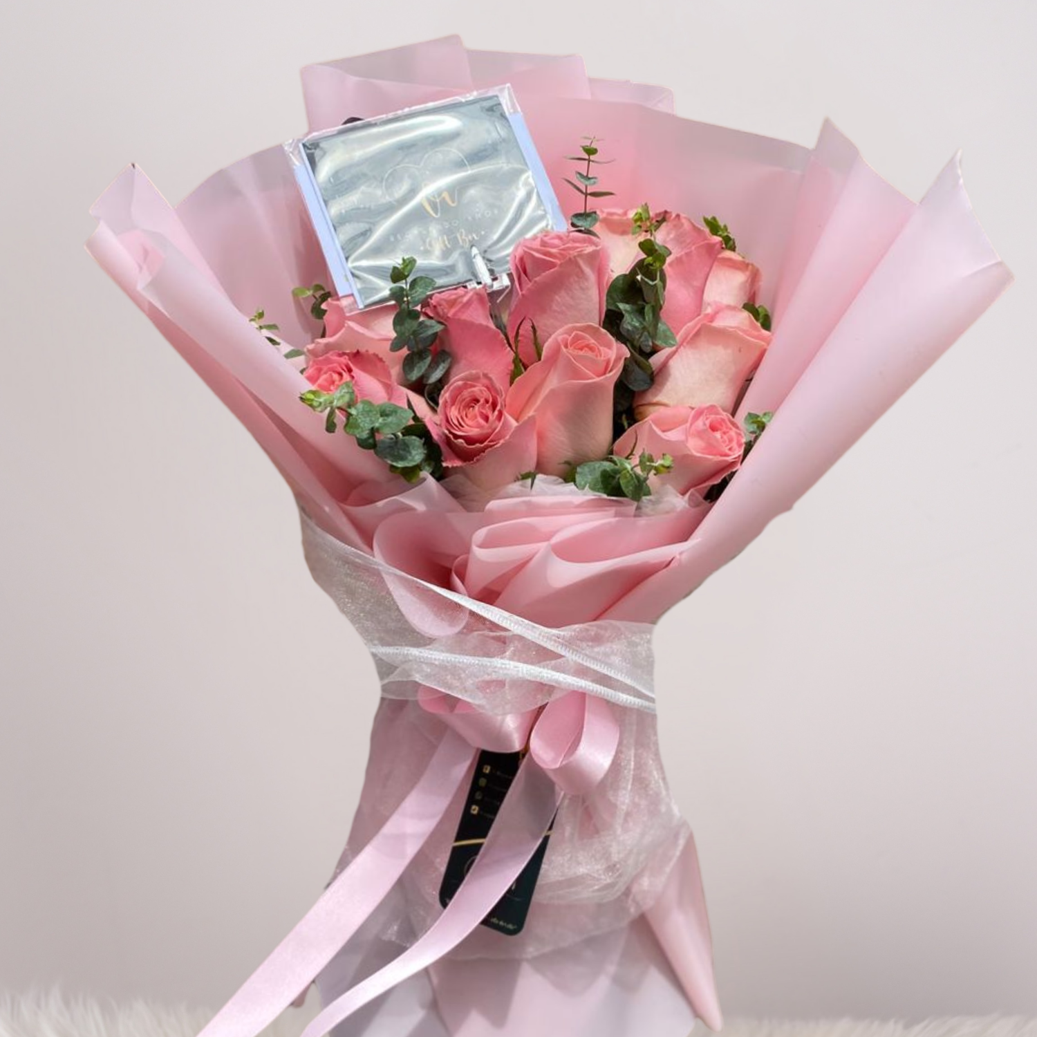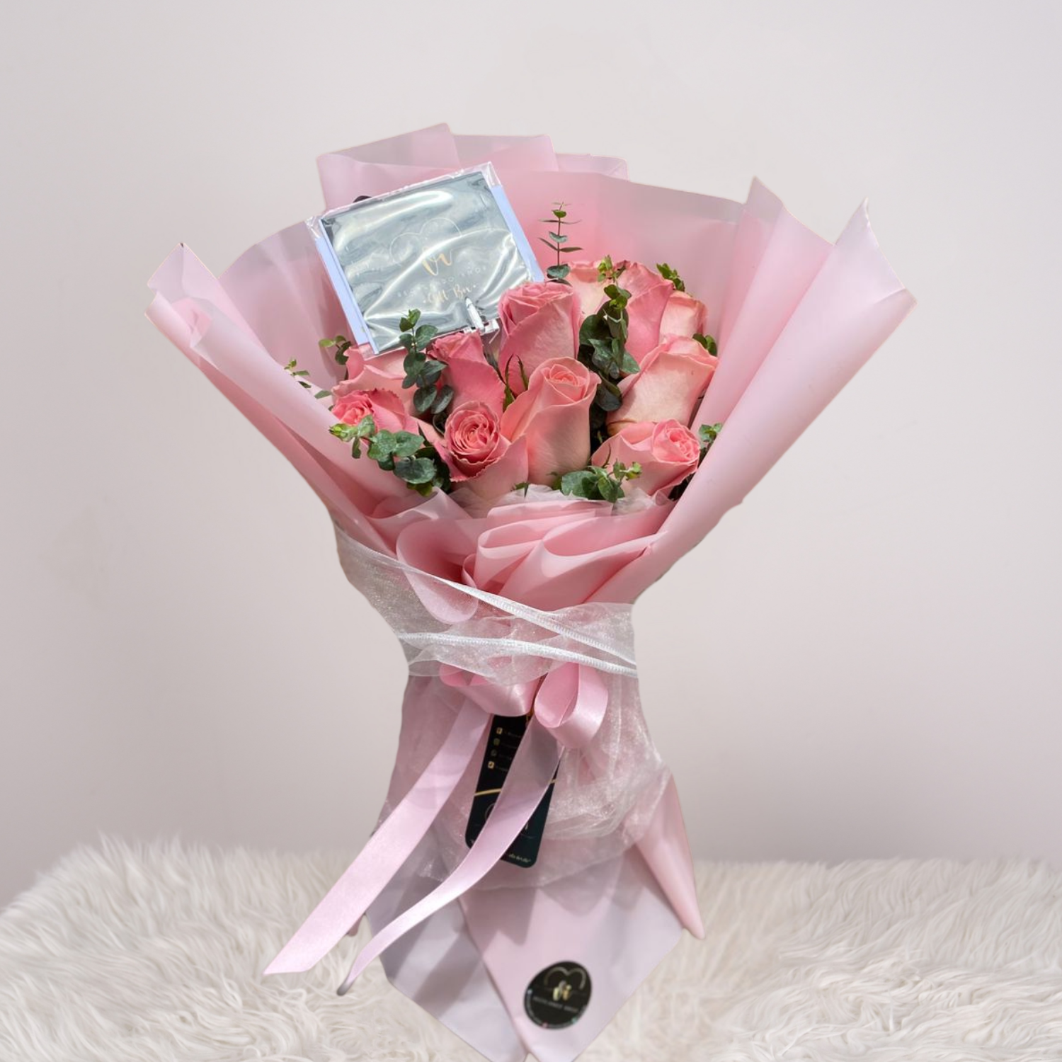 Ramo de 12 rosas rosadas acompañado de follaje fresco. Un detalle clásico y elegante que transmite ternura, amor y gratitud. Perfecto para regalar en cumpleaños, aniversarios o momentos especiales.