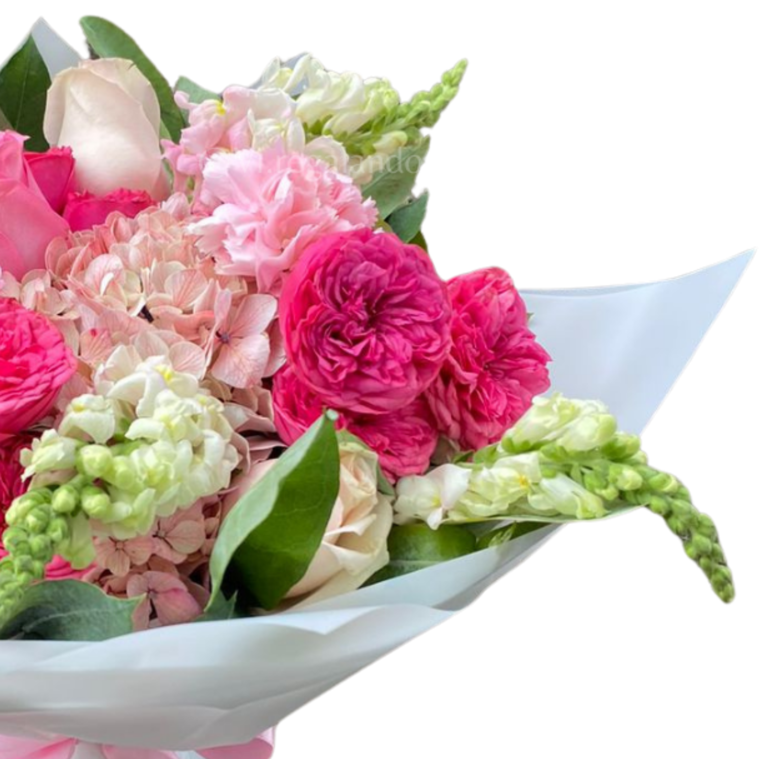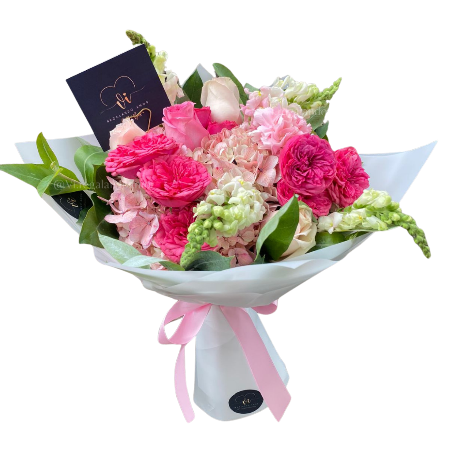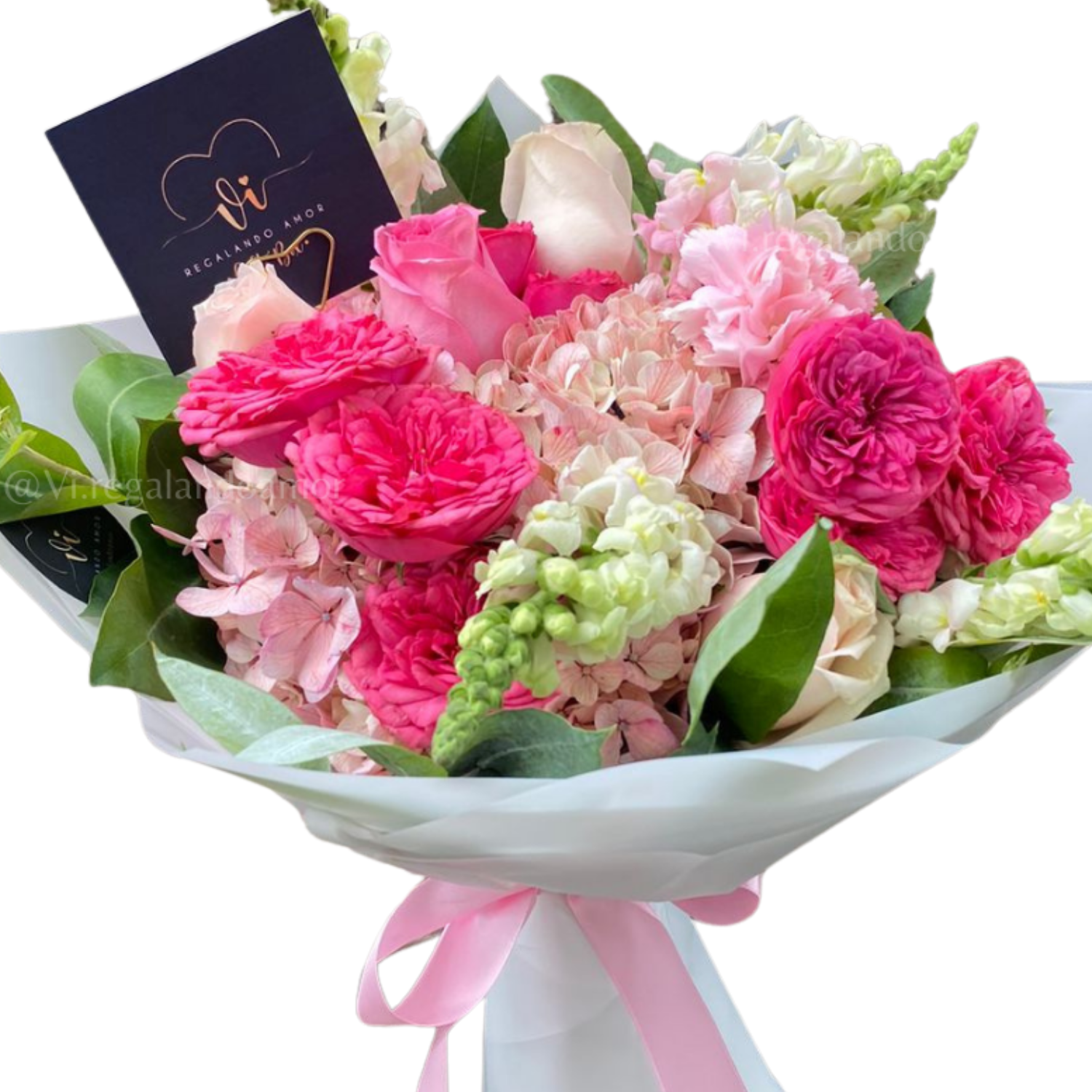 Ramo de rosas inglesas fucsia, con hortensia, rosas y variedad floral.