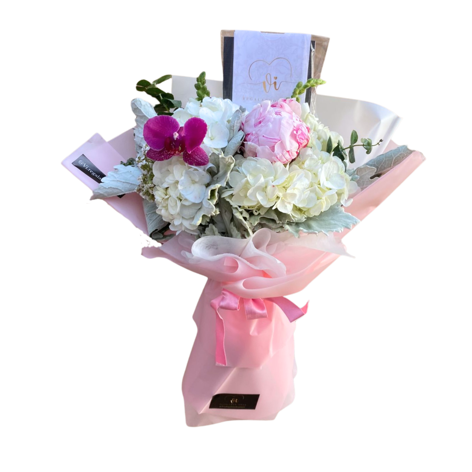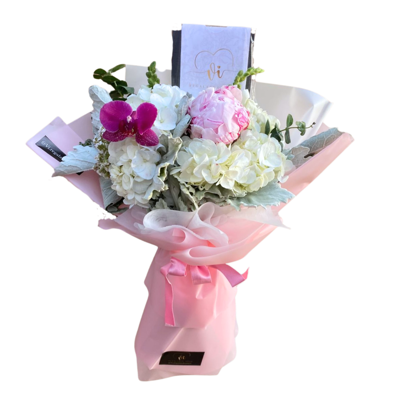 Ramo compuesto por una peonia, orquídea, hortensias y variedad floral en tonos delicados. Un diseño elegante y romántico, perfecto para sorprender en cualquier ocasión especial.