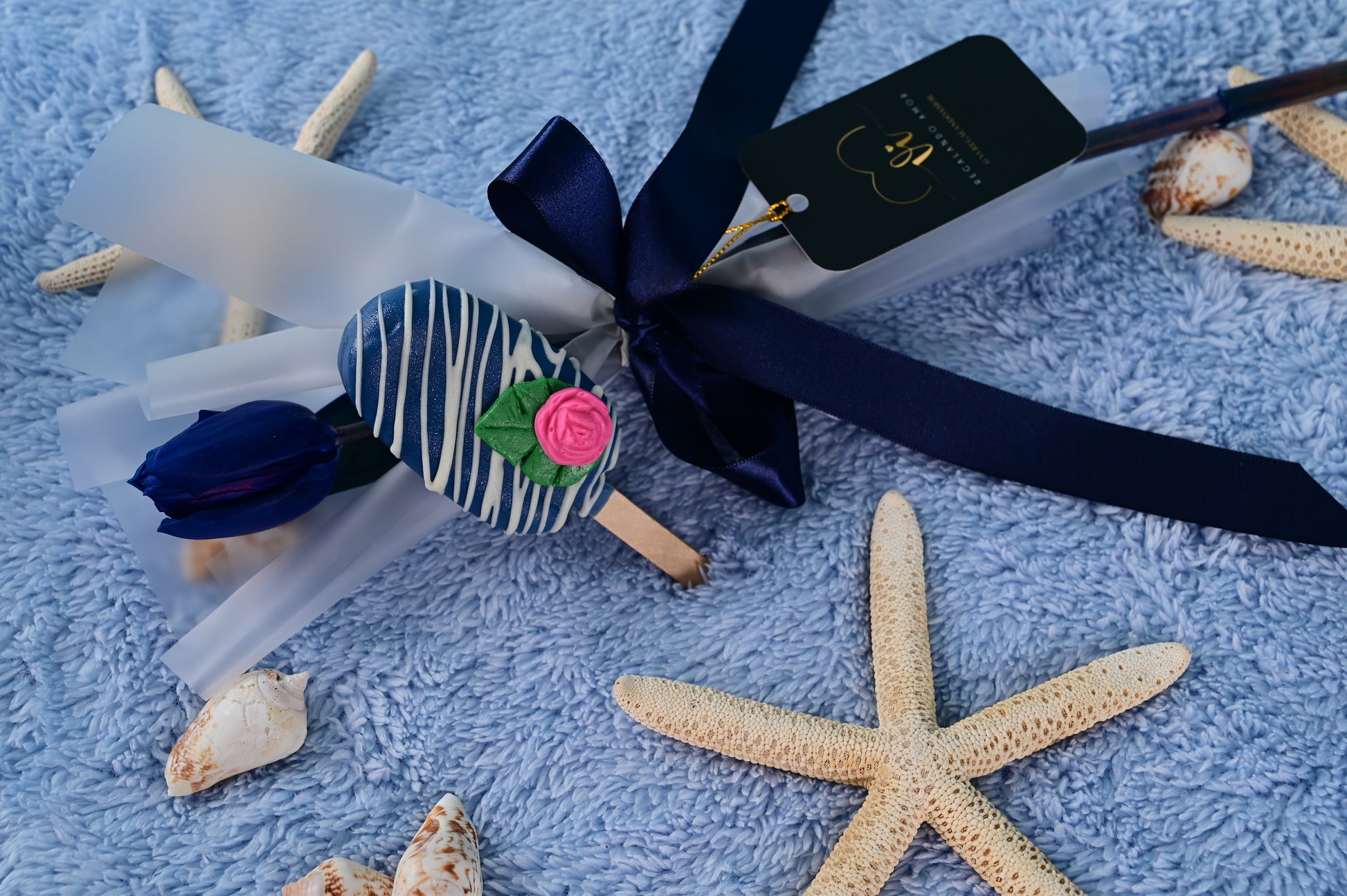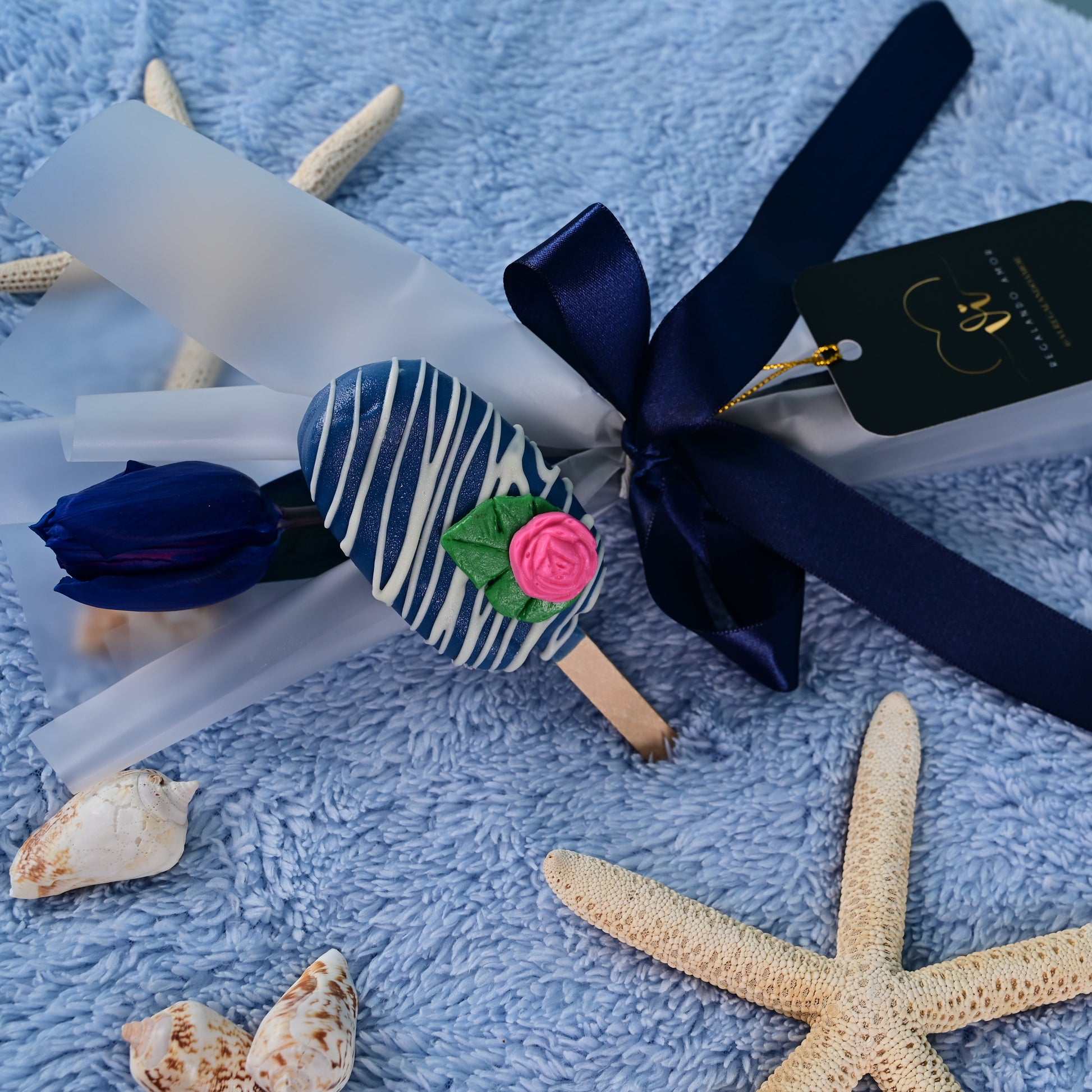 Un dúo que enamora a primera vista. Este detalle incluye un tulipán azul pigmentado , símbolo de lo extraordinario y especial, acompañado de una deliciosa paleta de keke esponjoso bañada en chocolate , decorada con motivos inspirados en Lilo & Stitch (live action) .